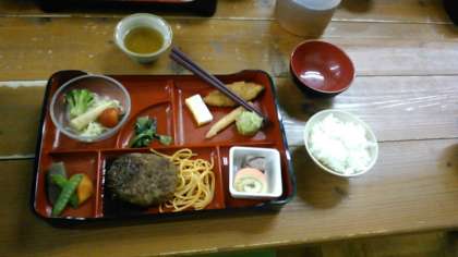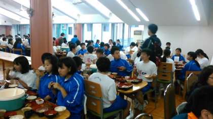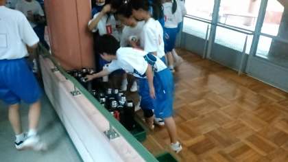 今日の夕食です。ご飯と汁物は、おかわりできます。少年自然の家に着いてから、ずっと身体を動かしていたので、みんなしっかり食べていました。お茶を入れてもらうために食堂に入る前に水筒を持って来たときの様子です。