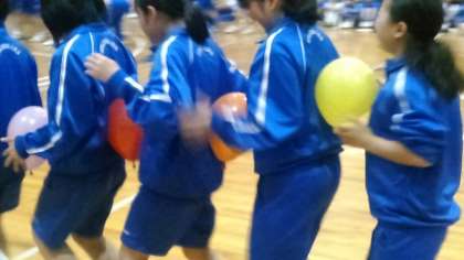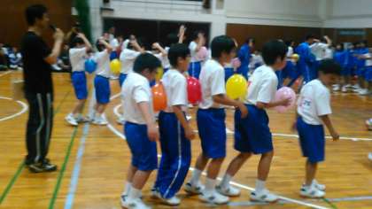 5人が風船をはさみながら、男子から、女子へとリレーをします。