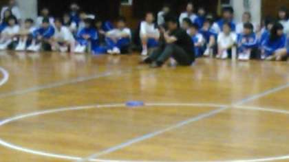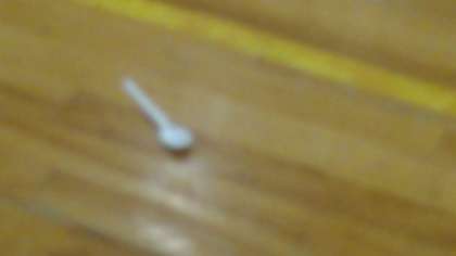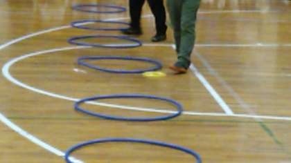 フリスビーを投げて、ゴールのフラフープに入るか、近くにいけば勝ちとなる。スプーンは目印です。