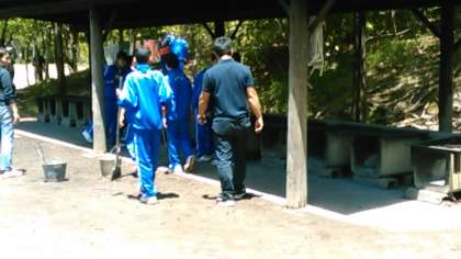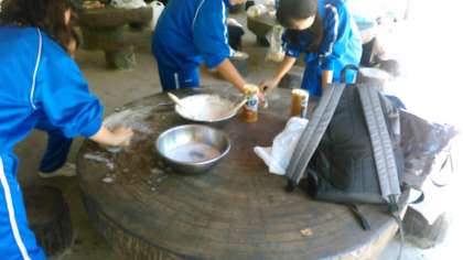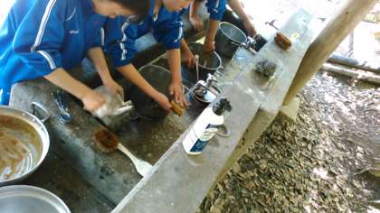 使ったテーブル、鍋や食器をしっかり美しくします。かまどの後始末もしています。