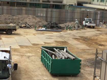 取り出された塩化ビニール製の口径の大きなパイプがたくさん、廃棄物搬出用コンテナに積み込まれていました。