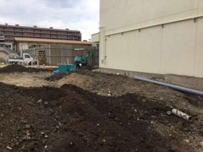 6号館校舎壁面に沿って、新しい雨水埋設配管工事が進んでいました。梅雨の時期を前にして、今後雨水が流れ込むことになる配管が、間もなく完成とのことでした。