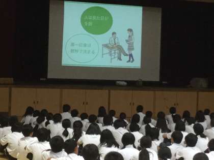 5月31日(木)の6限目、1年生の総合の時間に「着こなしセミナー」がありました。制服メーカーの方にお越しいただき、正しい制服の効用・着用法の講演をしていただきました。