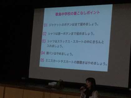 「一人ひとりが歌島中学校の代表」との自覚を持って、「ステキな着こなし」をしてください。私にとってもためになるお話でした。