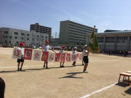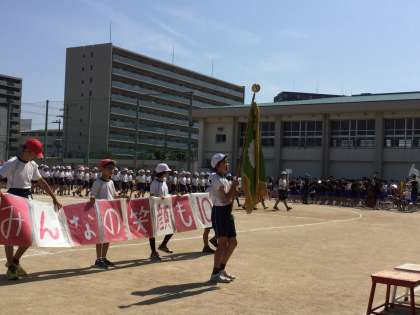 晴天のもと、小学生は「運動会みんなの笑顔も10倍」のスローガンを掲げての入場です。