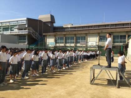 6月4日(月)の全校集会は、梅雨入り前の快晴のもとで行いました。