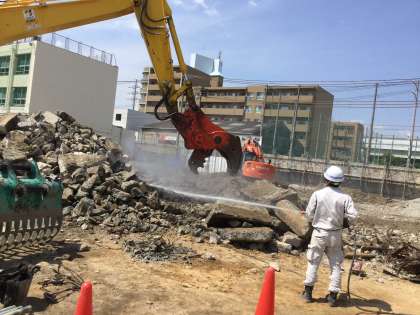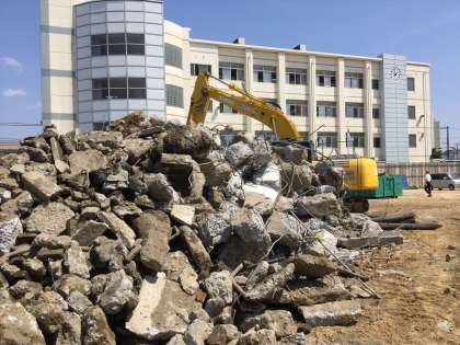 ゴミ置き場の入り口あたりの地面であった場所の地下で、重機の先端がコンクリートをひっかけました。辺りの土を取り去ると、建物の基礎として利用されていたコンクリートの遺構で、かなりの面積で出てきました。この場所は30数年間前まで、木造平屋の技術科工作室があった場所で、解体後グラウンドの一部として利用されてきました。