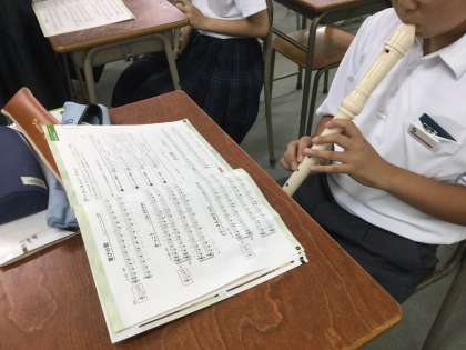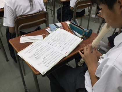 「メリーさんのひつじ」を、姿勢や息の入れ方などに注意をはらいながらの演奏です。音楽科の泊先生とともに机間巡視をしながら、こまめな指導をしていただきました。生徒達も楽譜を見ながら、一生懸命吹いていました。