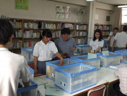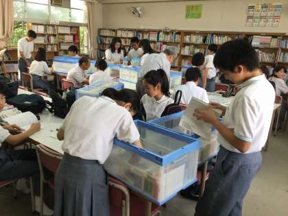 各クラスから持ち寄ったコンテナから本を取り出し返却し、新たに選ばれた本をコンテナに詰め込んでいました。本を選定しコンテナへと運んでいる文化委員には、楽しげな表情があり結構な賑わい感を感じました。