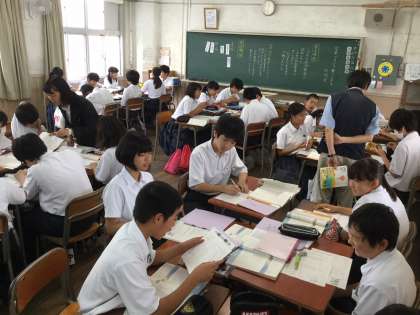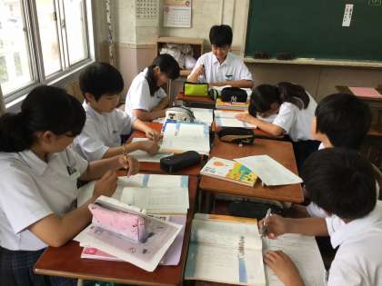 記入後には、机を動かして班編成とし、お互いの意見を交えて、他人の意見をプリントに記入していました。生徒達はお互いの意見を活発に話しあっていました。