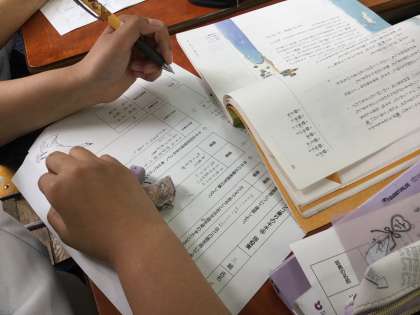 主人公キキが4回宙返りをやって、幸せだったのか、不幸せだったのかを文中の具体例を用いて、配付プリントに記入していました。