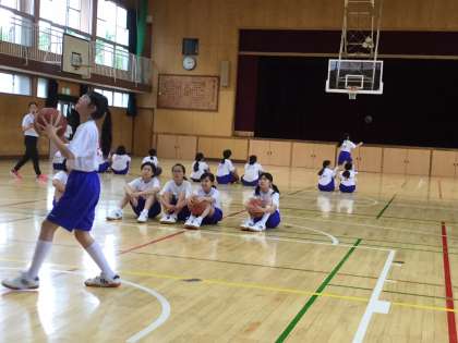 本日の種目はバスケットボールで、ゴール下のシュート練習を行いました。また30秒間で自分一人で何本のシュートが打てるかも競いました。