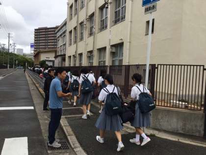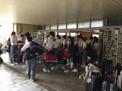 クラスごとに体育館から出発し、緑陰道路脇に駐車しているバスに向かいました。