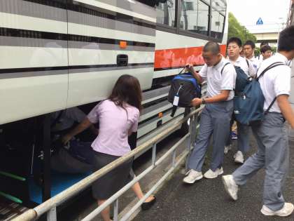 バスガイドさんが笑顔で迎えてくださっていました。バスにたどり着き次第、乗務員さんにカバンを預け、トランクルーム収納していただきました。トランクルーム内がすぐに荷物で埋まっていきました。