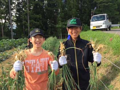 両手にラッキョウを持って、すでに農家に馴染んでいますね。