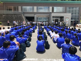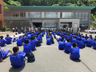 大岡村文化センターにて、民泊から戻ってきた5組〜8組生徒が、退村式を行っています。
