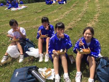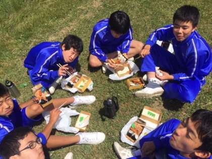 白馬村に入り絶好の景色の中、7組の生徒達がランチタイムです。