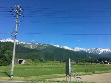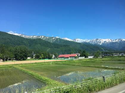 山に残る雪の白さと、水田に植えられた早苗の緑のコントラストが、美しさをかもし出しています。