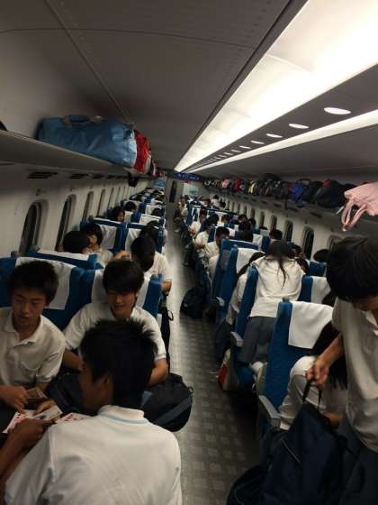 2分間という短い停車時間で、300人ほどが乗りきれるかヒヤヒヤしましたが、なんとか乗車完了、無事出発。皆楽しそうに過ごしています。