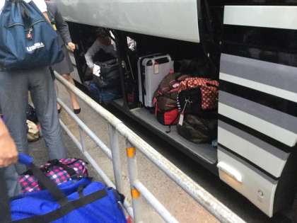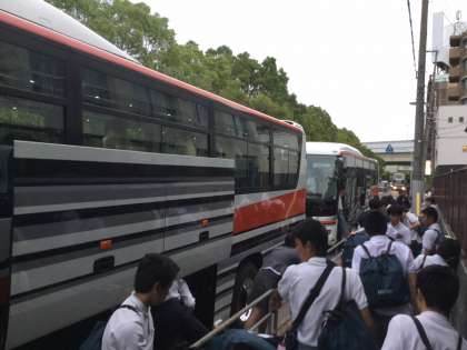 到着とともに生徒達も降りてきました。早速乗務員さんに、トランクルームからカバンを取り出していただきました。