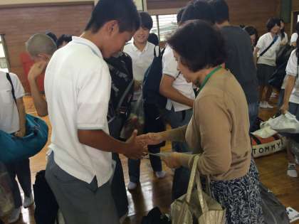 受け入れ家庭の方と握手をして、民泊スタート。