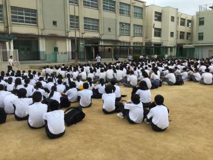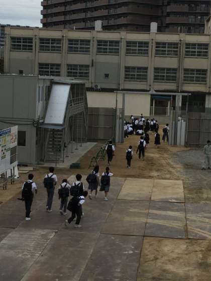 クラスごとに整列し腰を下ろして安全な状態が確認できるまで待ちました。多くの生徒が集まったところで、立ち上がって整列と点呼をしています。