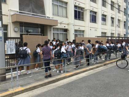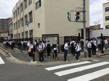 早めの昼食を済ませた生徒達は、12時10分頃から1号門・2号門から一斉に下校となりました。先生方に校外に出向いて、安全確認を兼ねて下校指導をしていただきました。