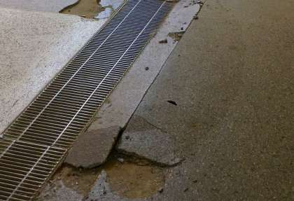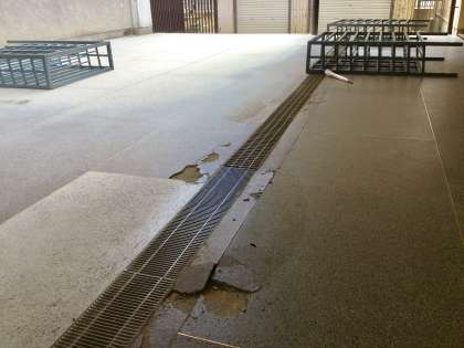 また入口前の床面に塗ってあったコンクリートが、めくれあがっていました。地震の揺れで両側から相当の力で圧迫されたことでしょうね。翌19日に管理作業員さんに、浮いてた部分を取り去ってモルタルで補修していただきました。