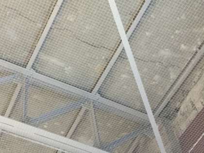 講堂では、亀裂が入っている天井材も見かけました。建物の強度や落下の恐れがないものでまずは安心です。講堂の天井には4年前の改修時に、全面的に落下物防止ネットを付けてもらっています。