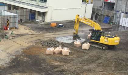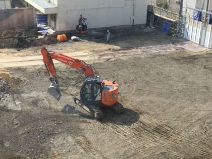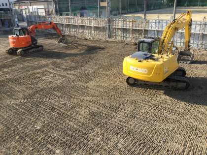 土の安定性を増すための地盤改良がおこなわれていました。セメントの粉が入った大きな袋が運ばれ、全体にまぶして混ぜてからならしていました。