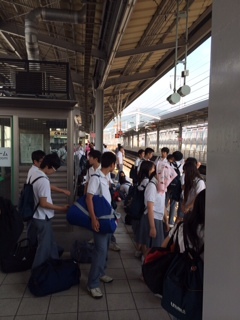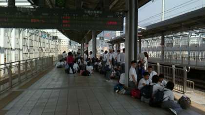 小倉駅15時46分発の、のぞみ46号にのります。ホームで待っています。