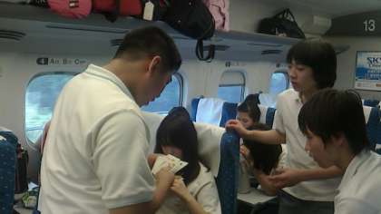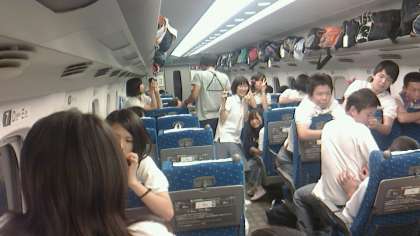車中でのくつろぎです。小倉駅で乗車したときは、疲れて寝てた生徒たちも起きてきて、元気にゲームとかたのしんでいます。あと30分で新大阪駅に到着予定です。