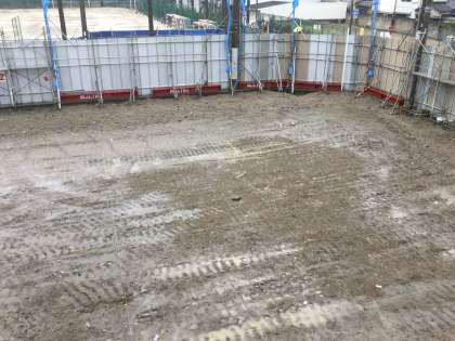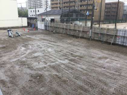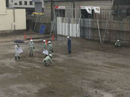先週整地後の測量が行われていました。梅雨に時期にあたり、小雨の降る中の作業でした。