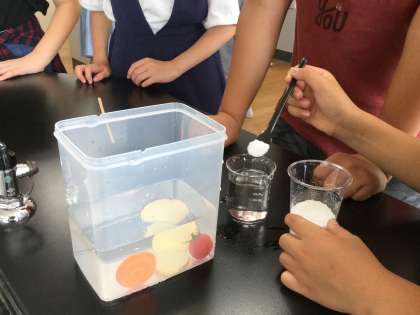 5人ほどの班ごとに、水槽に水を張り4種類の野菜を入れたら、全て沈んでいます。ビーカーで塩を溶かして食塩水を作り、どんどん塩分濃度を濃くしていきます。