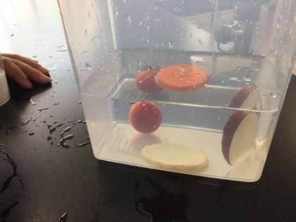 塩分濃度を利用したこの実験から分かったことは、持った時の重さで重いものが沈み軽いものが浮くわけではないことが分かりました。中身の濃いものが沈む、「中身のつまり具合」すなわち密度で決まることが分かりました。
