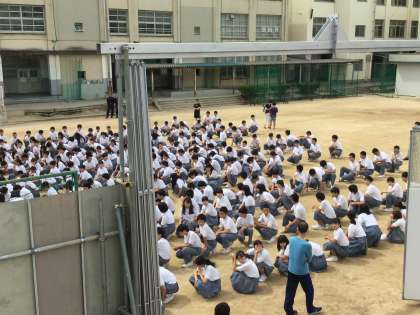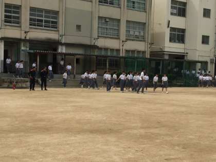 2年生は、4号館前の第1グラウンドに避難しました。2年生校舎の前につき比較tr黄スムーズに集合できたようです。