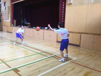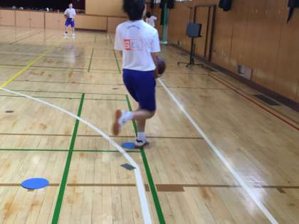 2人一組の対面パスや、レイアップシュート練習が行われていました。レイアップシュートでは、シュート前のステップの位置が大切で、歩幅を調整できるように、ブルーのマーカーを置いて分かり易く説明されていました。