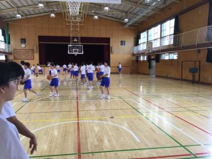 3年5・6組の男子は、体育館でバスケットボールの授業でした。スペースを攻め、有効なパスを出す技術を身につけることを目標とした授業でした。
