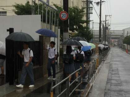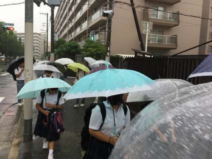 生徒達が登校する時間帯も強雨が続き、傘をしっかり握りしめての登校となりました。