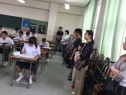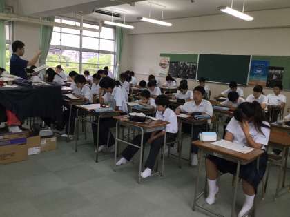 1年4組が、4号館2階の音楽室で授業を受けていました。音楽の鑑賞をしているところで、先生から説明を生徒達は聞いているところです。