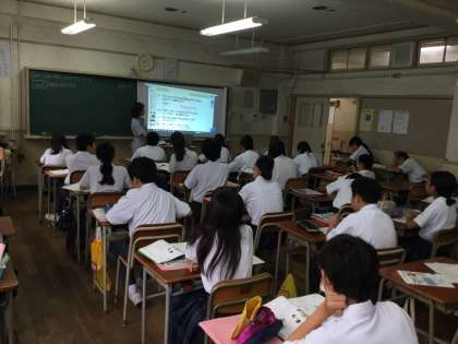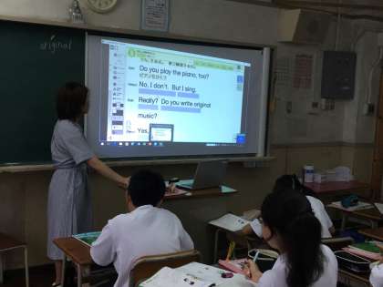 1年5組の英語の授業です。一部蛍光灯を消して、液晶プロジェクターから鮮明な画像が映し出され、生徒達が単語を入れ替えて答えていました。