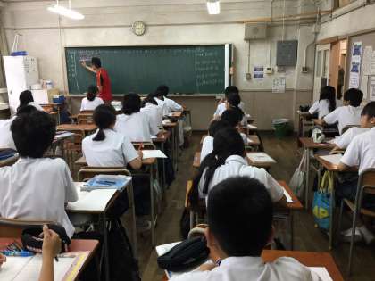 1年6組では、数学の方程式の学びでした。先生の元気で大きな声が響いていました。