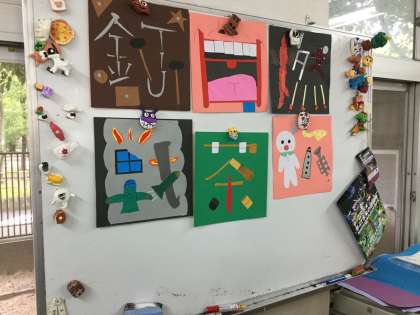 2年1組は美術室での授業でした。漢字のイメージに合うように、台紙の色画用紙に違う色の色画用紙を、張ったり・くりぬいたり・切り刻んだりしての作品制作でした。