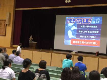 ペップトークとは、元気・活力の意味です。アメリカのスポーツの試合前に監督・コーチが選手に対して行う、「短くて」「わかりやすくて」「肯定的な」「魂を揺さぶる」勇気づけのショートスピーチ・前向きな背中の一押しの事ですと伝えられました。