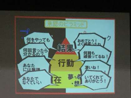 ペップトークの反対の言葉ブッペトークとを対比して話されました。ポジティブ語で、相手の状況を受け止めて、短くて、わかりやすく、人をその気にさせる、言葉がけと話されました。人を応援するときは、承認のピラミッドを考えて言葉がけをするように。(上の写真の言葉)