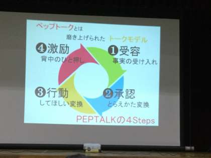 ペップトークとは磨き上げられたトークモデルとあり、ペップトークの4ステップス(下の写真)が示されました。