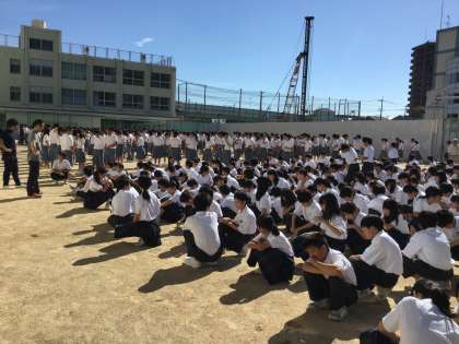 7月9日(月)は先週の強雨とは真逆の天気で、快晴で朝から高温下の厳しい直射にさらされての全校集会となりました。1年生の集合が早く、8時20分頃には整列をし腰を下ろしていました。(上の写真)