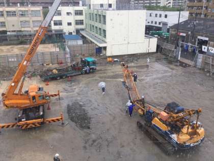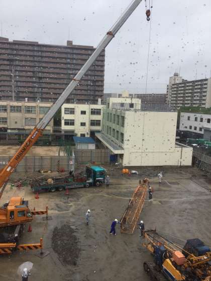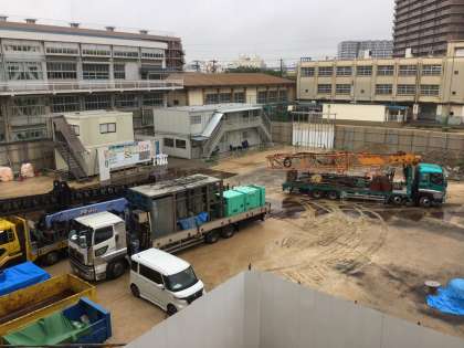 先週の金曜日7月6日に、杭打ち機材の搬入がありました。朝からロングボテイーの運搬車が、ひっきりなしに現れて機材を運んできました。