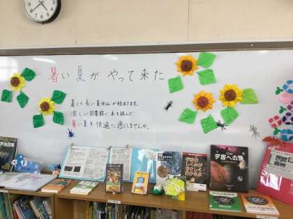 図書室の掲示板は7月の装いに変わり、ひまわりに囲まれて色画用紙を切り抜いたカブトムシやクワガタが張り付いて、夏を演出していました。