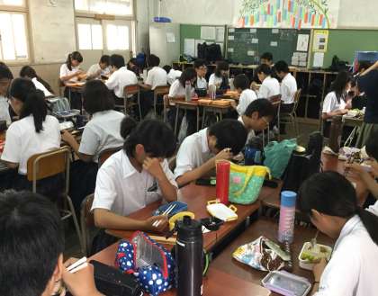 1年3組での昼食の様子を見せていただきました。給食当番の人に、カレーををお皿に分けてもらっていました。5〜6人の班になっての食事です。みんなの準備が揃ったところで「いただきます」。各班で談笑しながらの給食も最後ですね。